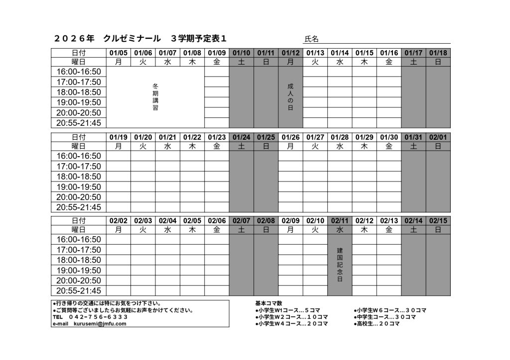 2025年冬期講習予定表